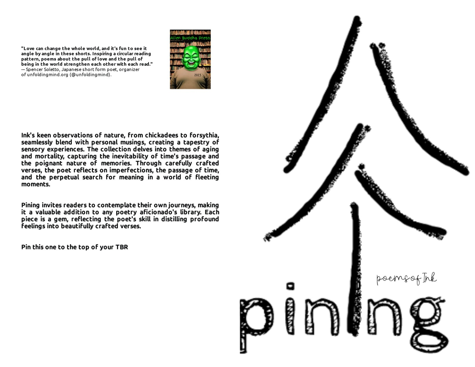 And because I was (and remain) so enamored of this woman with whom I fell so madly in love and who found herself a similar victim, I made it my mission to get this small collection of poems published. It only took one submission before Pining found a home at Alien Buddha Press. So it is my pleasure to announce that Pining will be available for purchase (from me and Alien Buddha Press) on November 14!