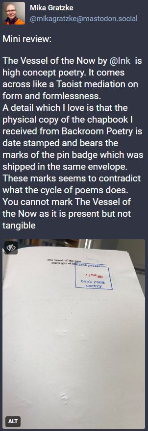 The title popped into my head while listening to the Nick Cave song “More News from Nowhere”; the word, nested in lyrics of a totally opposite hue, rang in my ears as soon as it was sung. The art came to me in a flash soon thereafter and is, at least I’d like to think, a gentle nod in the direction, via the lines’ placement and strokes, to Japanese characters and points to the reasons behind not only the form of some of the poems but the differences in focus and tone between sections I and II.